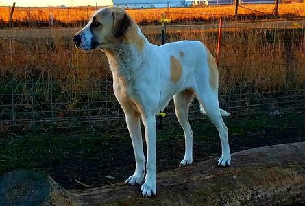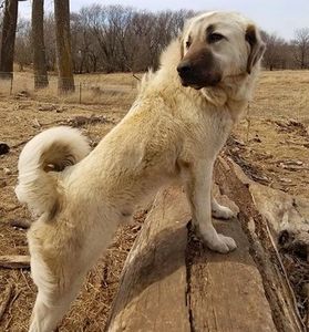 Ranger is our strong alpha male. He is cross-trained with goats and fowl. Ranger has always been fearless and when he was about a year old, he tangled with a coyote and tore his right ear. It healed folded and we believe the battle scar adds character to his fierce-yet-loving demeanor. It hasn't deterred him in the slightest as he has proven to be my most prolific coyote killer. He was born in a pasture with sheep and cattle.